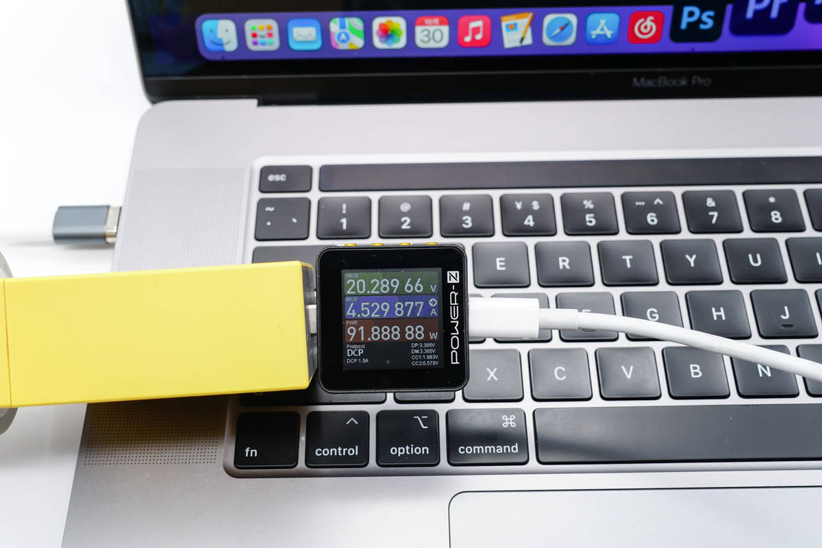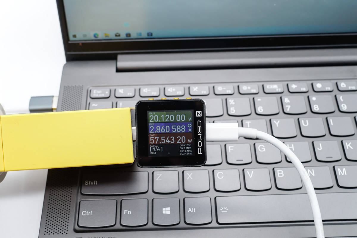 Trước hết, chúng ta hãy xem xét sạc nhanh. Sử dụng bộ sạc 100W với bộ chuyển đổi từ đầu thẳng để sạc máy tính xách tay với công suất 20.12V 2.86A 57.54W.