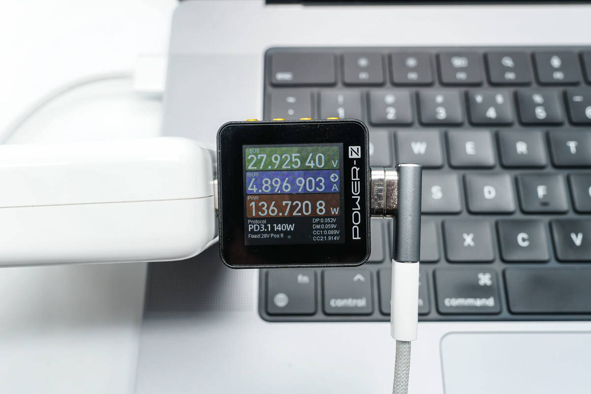 Ngay cả... nó cũng hỗ trợ sạc nhanh 140W và bộ chuyển đổi được kết nối với bộ sạc gallium nitride 140W của Apple và cáp sạc nhanh MagSafe 3. Lúc này, điện áp sạc là 28V và công suất là 135.72W.