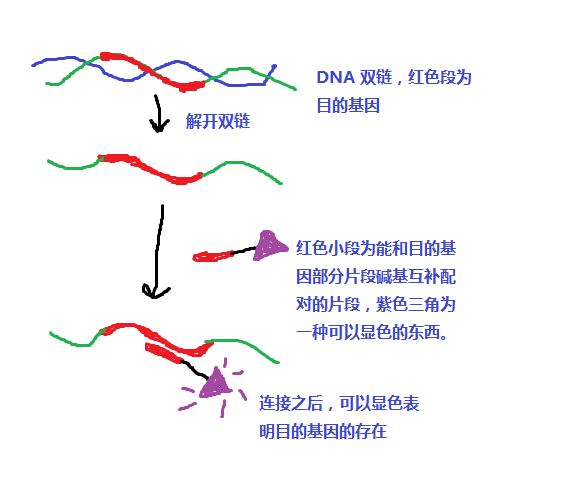 Trong điều kiện pH, nhiệt độ và cường độ ion thích hợp, đầu dò DNA có thể liên kết hydro với DNA hoặc RNA mạch đơn không được gắn nhãn bổ sung trong mẫu được kiểm tra bằng cách sử dụng độ chính xác cao của biến tính phân tử, biến tính và bắt cặp bổ sung bazơ. kết hợp với nhau để tạo thành một phức hợp sợi kép.